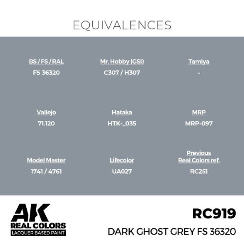 AK RC919 Dark Ghost Grey FS36320 Cette teinte fait partie du schéma « Compass Ghost » appliqué aux F-15 de l’US Air Force de la fin des années 1970 au début des années 1990.