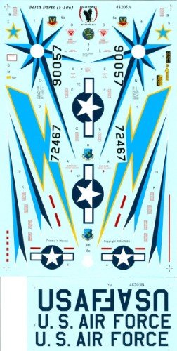 EAGLE STRIKE imprime chaque décalcomanie sur un film ultra-fin, ce qui assure une application fluide et un rendu sans surépaisseur visible. En outre, la planche ESP48205 inclut plusieurs options de marquages représentant des F-106 Delta Dart issus de différentes unités de défense aérienne américaines. Elle contient également les insignes nationaux, numéros de série, codes tactiques et emblèmes d’escadrille reproduits avec une grande exactitude historique. Par ailleurs, les couleurs respectent fidèlement les schémas gris clair et aluminium typiques des appareils de l’USAF des années 1960.
