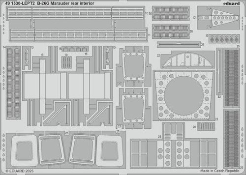 Le set Eduard 491530 est un ensemble de pièces en photo-découpe conçu pour améliorer l’intérieur arrière de la maquette ICM B-26G Marauder au 1/48. Il offre des détails ultra-fins pour les parois latérales, les structures internes et les éléments de la soute à bombes, permettant ainsi de sublimer le réalisme de la maquette.