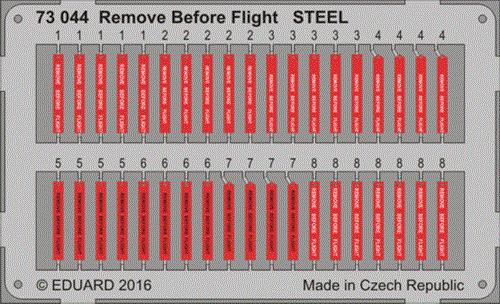 - 73044 – Étiquette « Remove Before Flight » en acier photo-découpé : prête à poser sur pitot, capots ou antennes