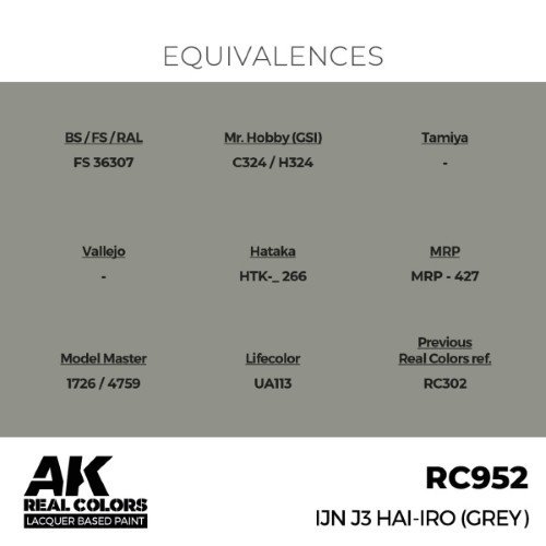 La référence RC952 reproduit la teinte J3 Haiiro, un gris spécifique utilisé par la Marine Impériale Japonaise (IJN) pendant la Seconde Guerre mondiale. Cette couleur était appliquée sur de nombreux navires, appareils et équipements, offrant un camouflage efficace en mer grâce à sa nuance intermédiaire