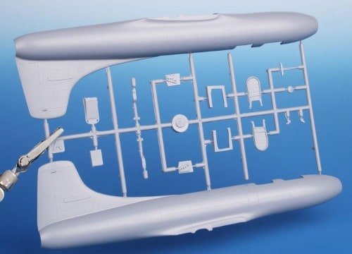 Contenu de la boîte Plastique, résine pour coque cockpit-splitter, roues, photodécoupe, deux verrières