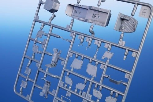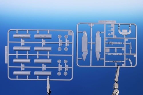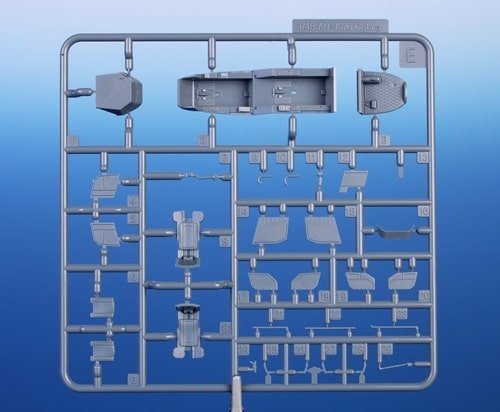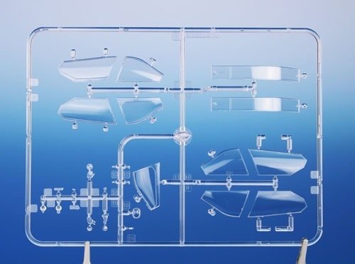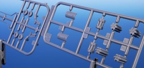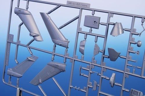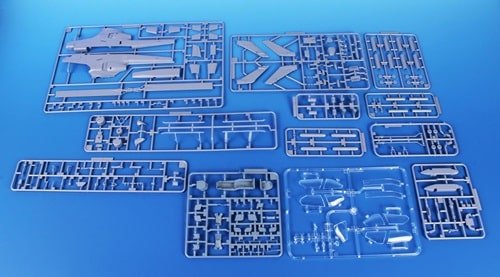 172 pièces en plastique gris et 11 en transparent, + pièces É / 3D résine comme rotor, train et cockpit