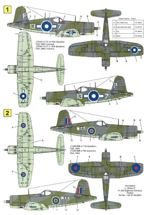 TECHMOD imprime chaque décalcomanie sur un film ultra-fin, ce qui assure une application fluide et un rendu sans surépaisseur visible. En outre, la planche TM32009 inclut plusieurs options de marquages représentant des F4U-1A Corsair de la Fleet Air Arm engagés dans les opérations du Pacifique et de l’Atlantique. Elle contient également les insignes britanniques, numéros de série, codes tactiques et emblèmes d’escadrille reproduits avec une grande exactitude historique. Par ailleurs, les couleurs respectent fidèlement les schémas de camouflage bleu foncé et gris clair typiques des appareils de la Royal Navy.